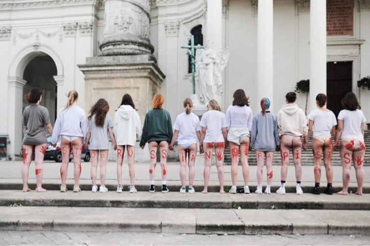 «Ukrinform» xəbər verir ki, iştirakçılar rusların Ukraynadakı vəhşiliklərinə dünyanın diqqətini cəlb etmək üçün qan şəklində qırmızı ləkələri olan alt paltarlarla etiraz ediblər.