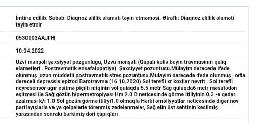 İmtina edilib. Səbəb: Diaqnoz əlillik əlaməti təyin etməməsi. Ətraflı: Diaqnoz əlillik əlaməti təyin etmir.