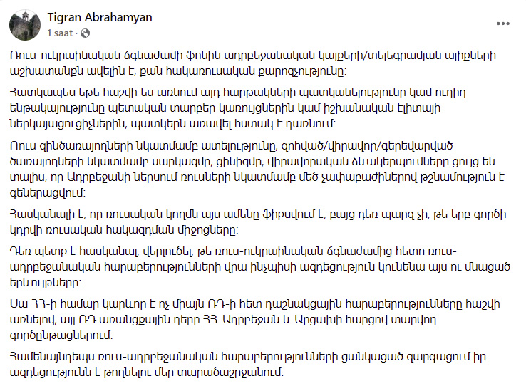 “Şərəfim var” fraksiyasının şərəfsiz deputatı Tiqran Abramyan özünün facebook səhifəsində Azərbaycanın sosial şəbəkələrini təhlil edərək bu qənaətə gəlib ki, ölkəmizdə rusofobiya halları getdikcə artır. “Rusiya-Ukrayna böhranı fonunda Azərbaycan saytlarının, telegram kanallarının işində Rusiya əleyhinə təbliğat geniş miqyas alıb” Tiqran Abramyan iddia edir ki, həmin platformalar müxtəlif dövlət strukturlarına və ya hakim elitanın nümayəndələrinə mənsubdur.