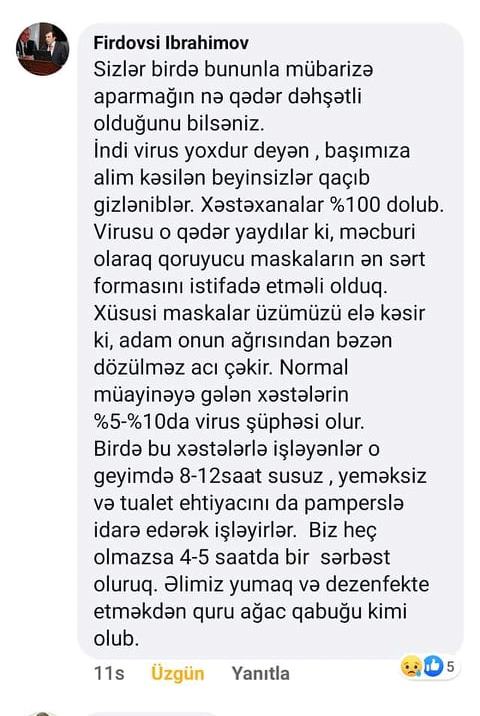 EDNews.net xəbər verir ki, bu sözləri sosial şəbəkədə Mərkəzi Klinikanın İnvaziv Kardiyologiya şöbəsində çalışan həkim Firdovsi İbrahimov yazıb: “Xəstəxanalar 100% dolub.Virusu o qədər yaydılar ki, məcburi olaraq qoruyucu maskaların ən sərt formasını istiadə etməli olduq. Xüsusi maskalar üzümüzü elə kəsir ki, adam onun ağrısından bəzən dözülməz acı çəkir. Normal müayinəyə gələn xəstələrin 5-10 %-ndə virus şübhəsi olur. Bir də bu xəstələrlə işləyənlər o geyimdə 8-12 saat susuz, yeməksiz və tualet ehtiyacını da pamperslə idarə edərək işləyirlər. Biz heç olmazsa 4-5 saatdan bir sərbəst oluruq. Əlimizi yumaqdan və dezenfektə etməkdən quru ağac qabığı kimi olub”.