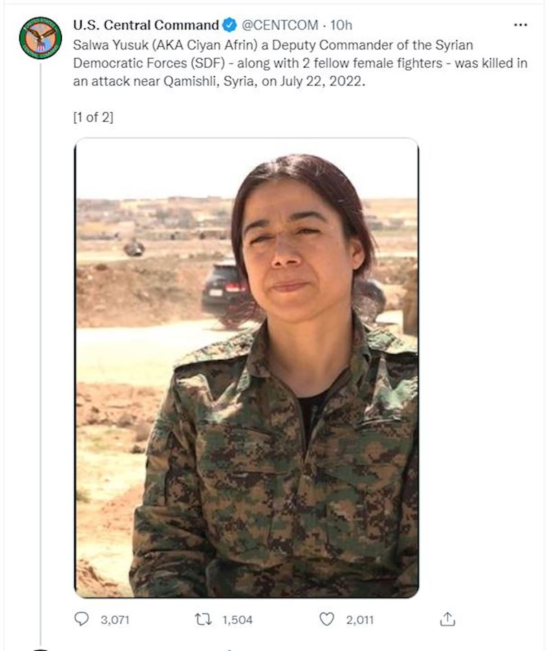 “Suriya Demokratik Qüvvələri (SDQ) komandanının müavini Salva Yuşuk (digər adı ilə Ciyan Afrin) 2 qadın döyüşçü ilə birlikdə 22 iyul 2022-ci ildə Suriyanın Qamışlı yaxınlığındakı hücumda həlak olub”.