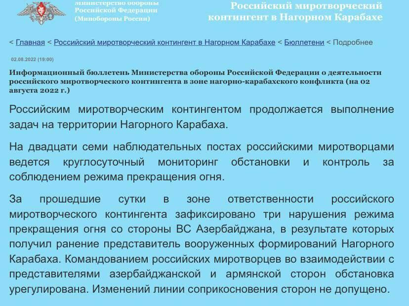 Rusiya Müdafiə Nazirliyinin bu gün yaydığı informasiya bülletenində yenə «Dağlıq Qarabağ» ifadəsi işlədilib. Habelə, bülletendə «Azərbaycan Ordusu tərəfindən atəşkəsin 3 dəfə pozulduğu» təki reallıqla heç bir əlaqəsi olmayan iddia yer alıb.