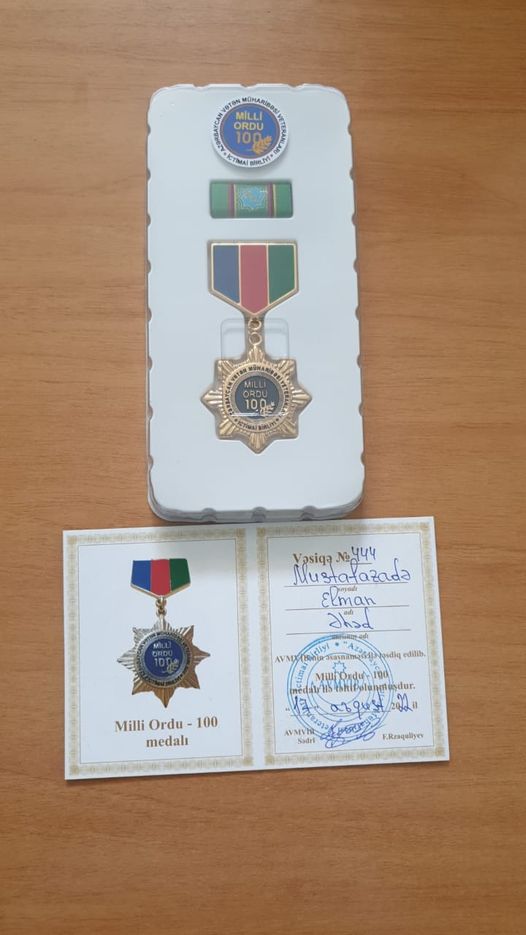 Elman bəy, sən demə asana can atan və hətta asanı əldə etmək üçün rüşvət verən sevimli xalqımız burada da asan və tez olanı seçib. Bunu yazmaqda məqsədim, bəzən abrına, bəzən də öz qüruruna qısılıb səssizcə işini görən və kimsənin görmədiyi, o cümlədən də sizin kimi haqqı olan Azərbaycan insanına zamanında danışmadığına görə qiymət vermirik. Çünki xainlər, saxtakarlar, istedadsızlar və s. iş görmədən danışarlar, basıb bağlayarlar. Çünki bizi eşitməyə adət etdiriblər, görəninsə gözünü çıxarıblar və biz döyüşçülər bu sırada fərqlənmək üçün Sizi, mənim təqdimatımla, Azərbaycan Vətən Müharibəsi Veteranları İctimai Birliyinin (AVMVİB) İdarə Heyətinin qərarıyla təsis etdiyi «Milli Ordu-100» Xatirə medalıyla təltif etmək qərarı verdik.