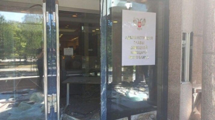 Raket zərbəsi nəticəsində bina yanıb. Qondarma respublikanın başçısı Deniz Puşilin zərər çəkməyib.