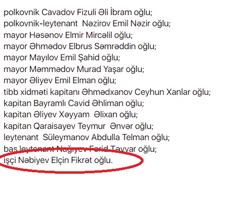 14 şəhidin içində adı «İşçi Nəbiyev” yazılan şəxs — təqaüddə olan polkovnik Nəbiyev Elçin Fikrət oğludur.