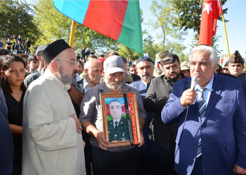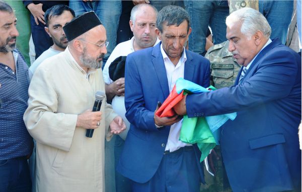 Şəhidin tabutuna bürünmüş Azərbaycan Bayrağını Əhəd Abıyev şəhidin atası İdris Süleymanova təqdim edib.