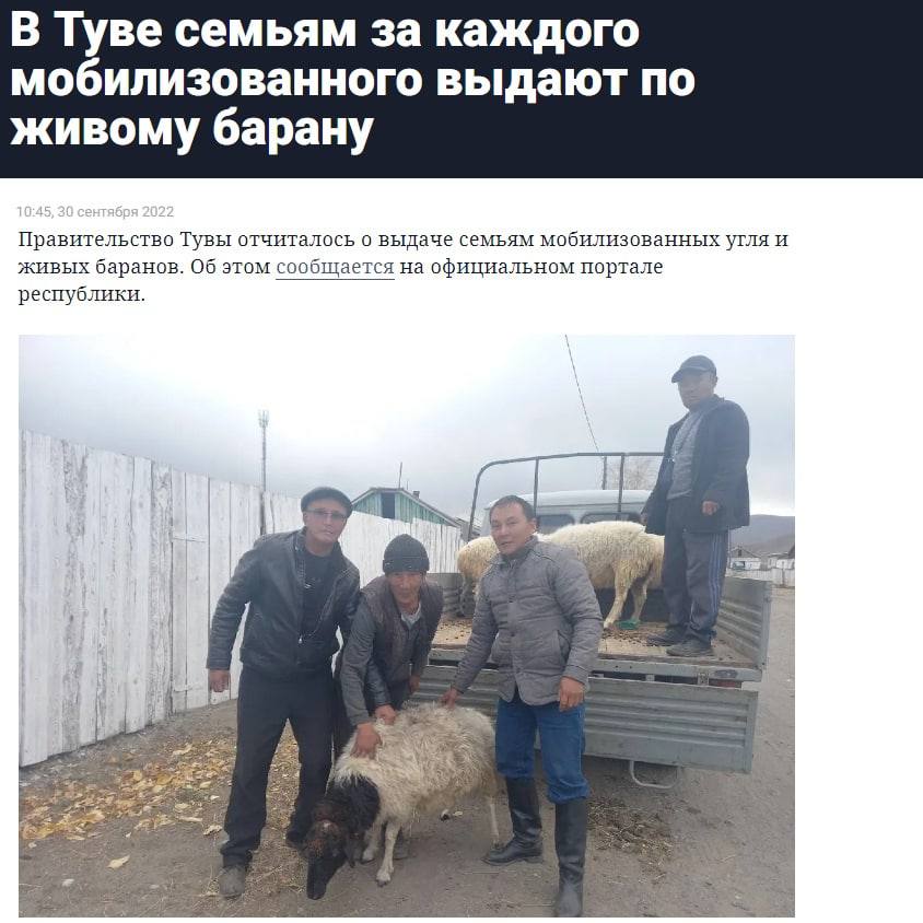 Tuva Respublikasının mətbuat xidməti ilk 91 qoçun artıq ailələrə çatdığını bildirib. Xırdabuynuzlu heyvanların paylanması bu həftənin sonuna qədər başa çatdırılmalıdır. Eyni zamanda, hakimiyyət səfərbər edilmiş kişilərin ümumi sayını açıqlamır.