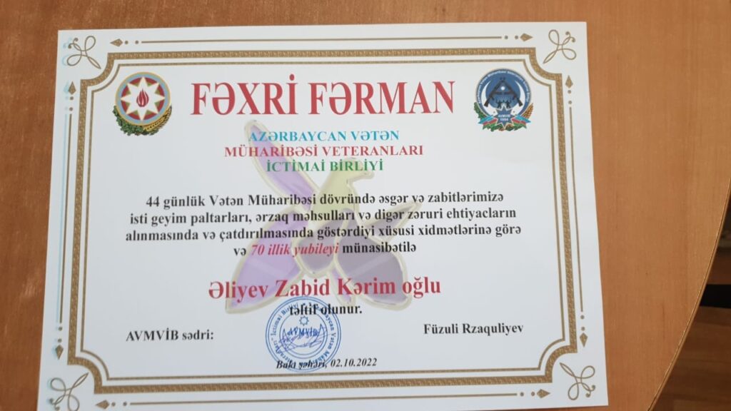 Zabit Kərim oğlu Əliyev Azərbaycan Vətən Müharibəsi Veteranları İctimai Birliyinin (AVMVİB) yarandığı ildən onun üzvüdür. Bu gün üzvümüz Zabit Əliyevin 70 yaşı tamam olur.