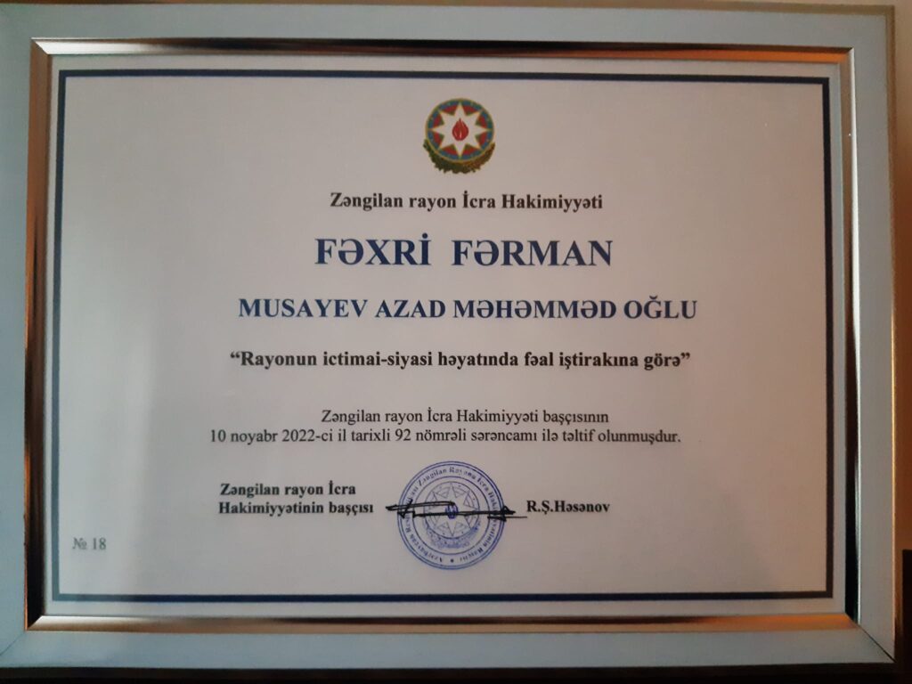 Sonda Zəngilan rayon İcra Hakimiyyətinin başçısı Ramiz Həsənov mənə Fəxri Fərman təqdim etdi.